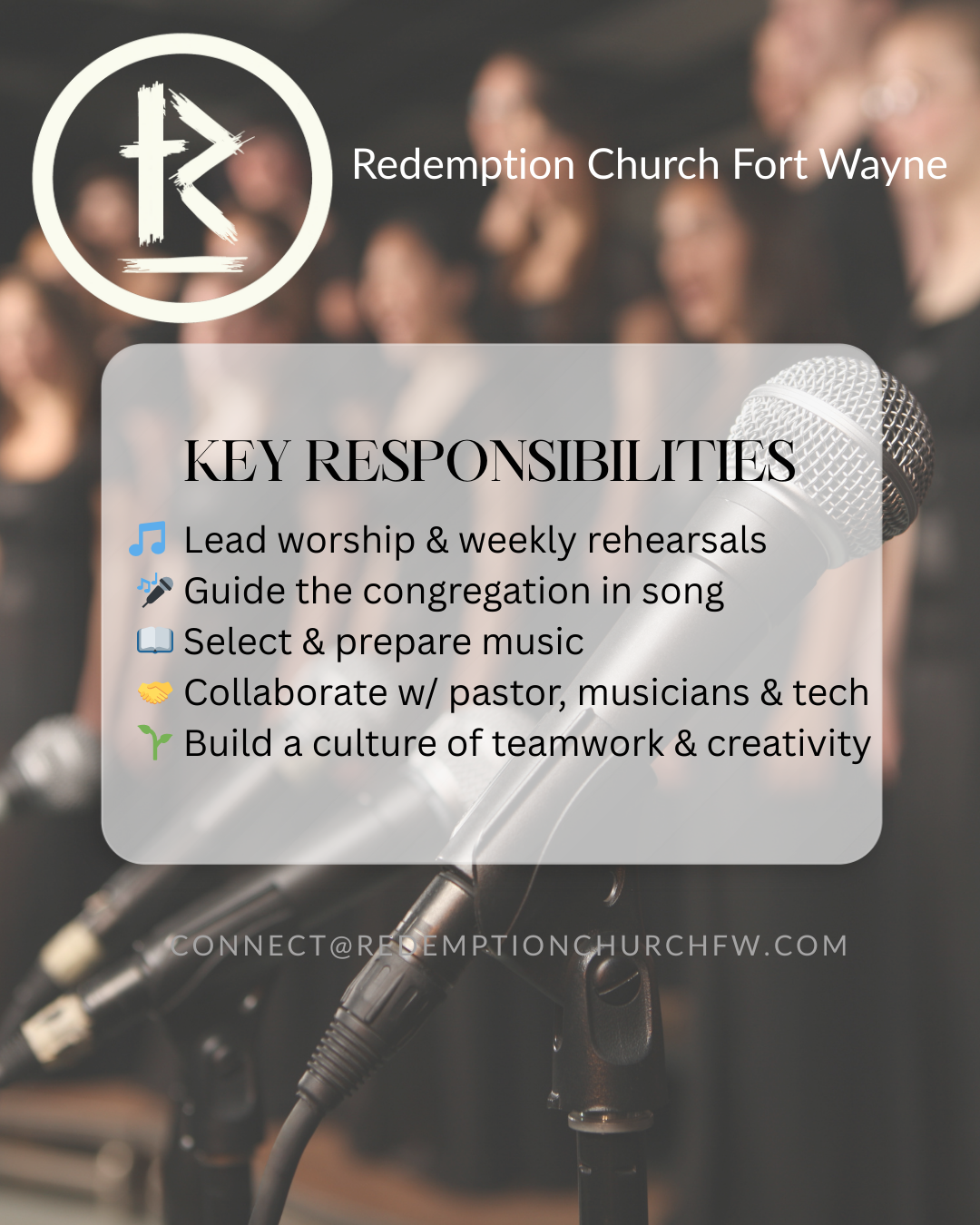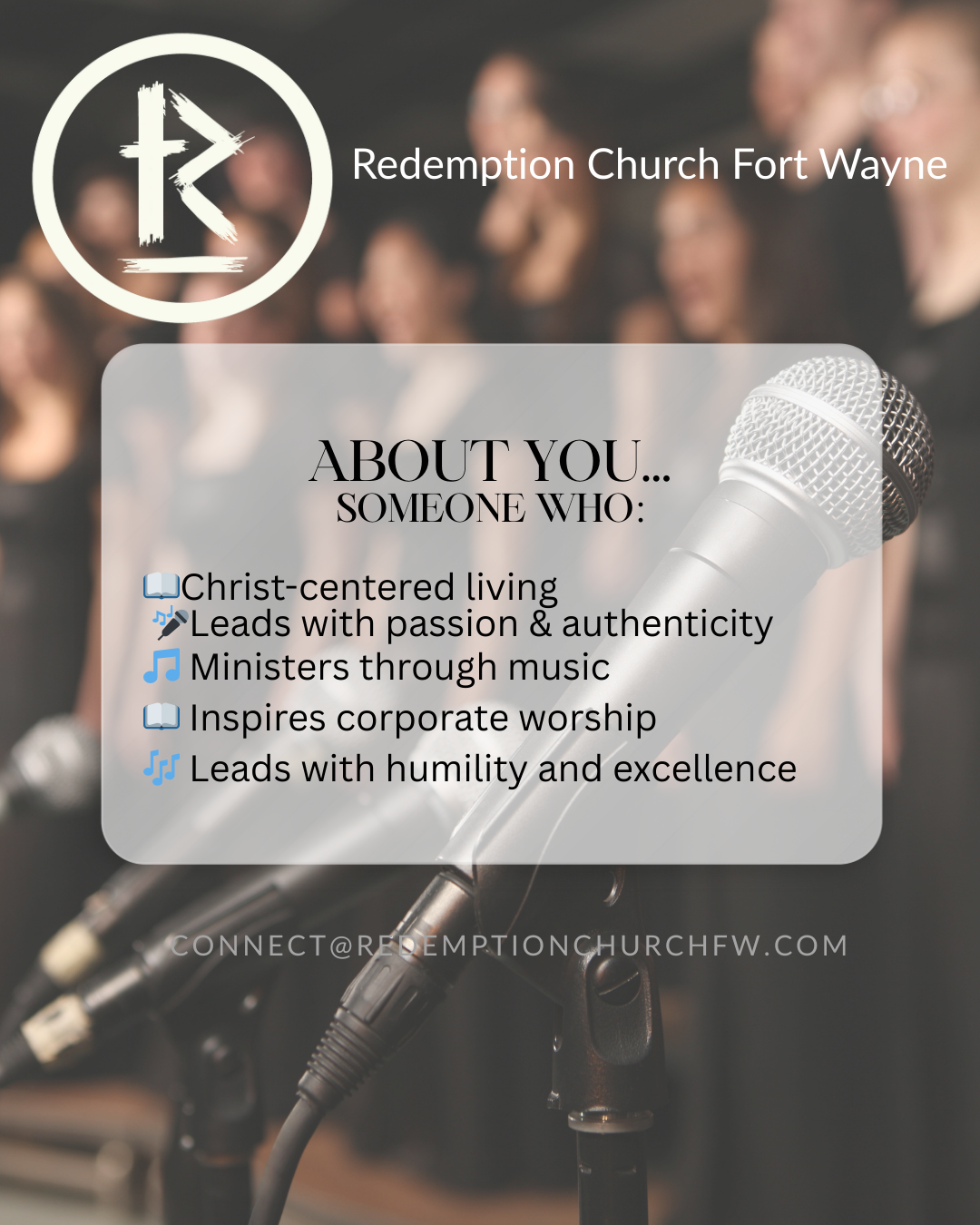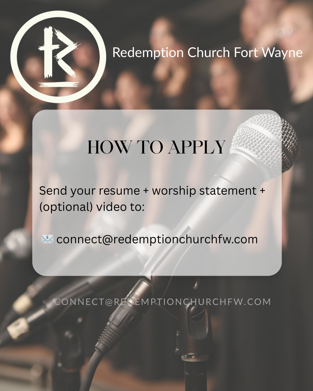 Send your resume, worship statement, and (optional) video to connect@redemptionchurchfw.com